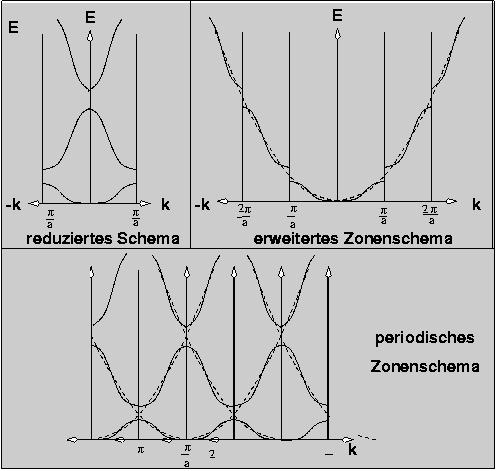 In der Bandstruktur (Abb. Mitte) ist die potentialfreie Parabel gestrichelt eingezeichnt.