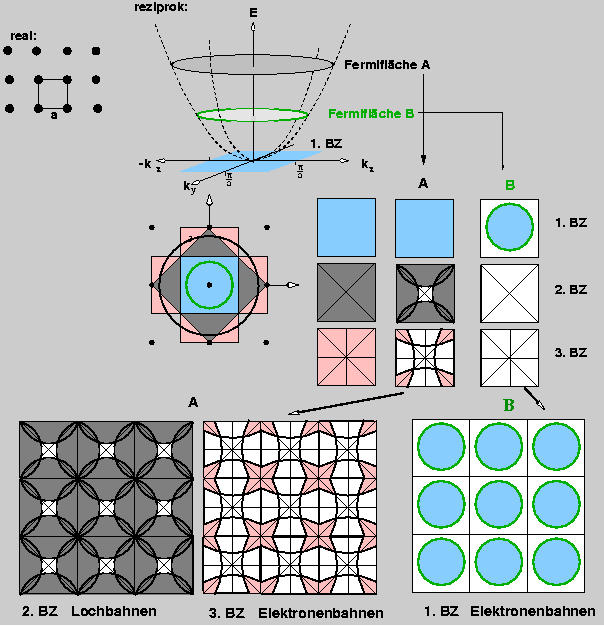 Danach liegen bei B reine Elektronenbahnen, bei A Lochbahnen in der 2. Brillouin-Zone (fast volständig besetzt)