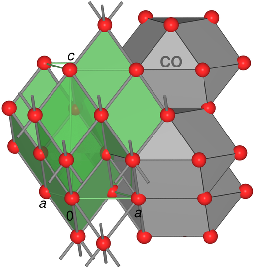 | Abb. 2.4.2. Struktur von elementarem Quecksilber (grün: Elementarzellen des verzerrter Po-Typ; grau: Kuboktaeder (CO) als Koordinationspolyeder der gestauchten f.c.c.-Struktur) |