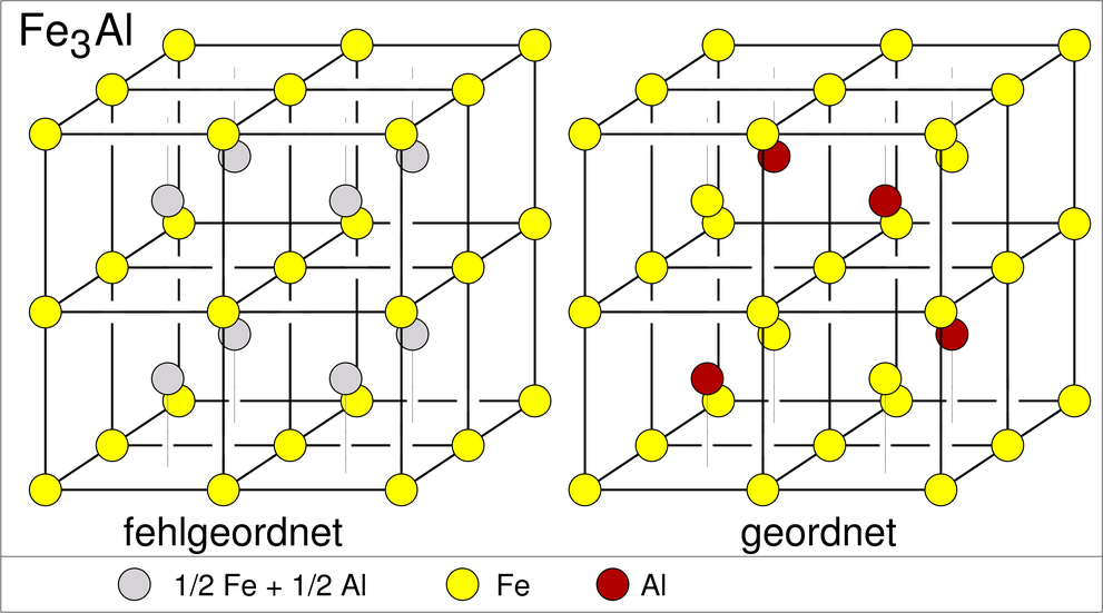 Die zweite wichtige Überstruktur der kubisch innenzentrierten Packung ist die mit AB3-Zusammensetzung, der Fe3Al-Typ (oben rechts). Die geordnete Variante ist kubisch mit der doppelten Achslänge des b.c.c.-Muttertyps. Eine ternäre Ordnungsvariante findet sich bei den sog. Heusler-Legierungen (nach Friedrich Heusler) wie z.B. Cu2MnAl. Ausgehend von Fe3Al sind hier die vier Teilwürfelzentren alternierend von Mn und Al besetzt. Einige Heusler-Verbindungen sind ferromagnetisch, obwohl keines der enthaltenen Elemente selber Ferromagnetismus zeigt. Sie sind in der Spintronik wichtig und einige von ihnen sind seit 2006 als sogenannte 'toplogische Isolatoren' (topological insulators) bekannt geworden.