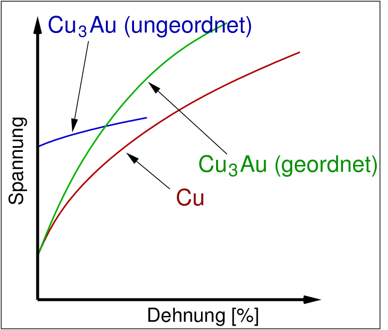 Das Spannungs-Dehnungs-Diagramm zeigt, dass die geordnete Legierung (grüne Kurve) deutlich härter ist als reines Kupfer (rote Kurve). Bei kleinen Spannungen ist die ungeordnete Legierung (blaue Kurve) weniger dehnbar als reines Kupfer oder die geordnete Legierung, d.h. für Anwendungen in der Mechanik günstiger. Bei größeren Spannungen ist die geordnete Legierung fester (weniger dehnbar).