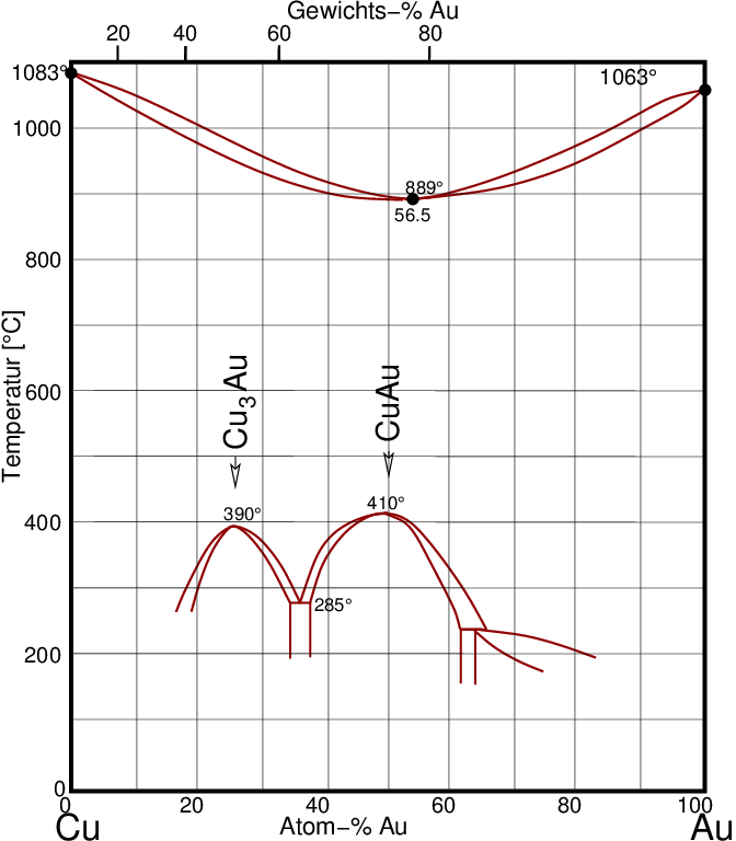Im System Cu-Au bilden sich bei den Zusammensetzungen CuAu und Cu3Au Überstrukturen aus.