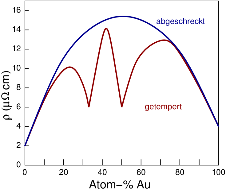Der Verlauf des elektrischen Widerstand mit dem Cu/Au-Verhältnis (Abb. 3.2.2. rechts) zeigt, dass die Legierungsbildung grundsätzlich zu einer Erhöhung des elektrischen Widerstands führt. Bei geordneten Legierungen (rote Kurve) ist der Widerstand jedoch geringer als in der ungeordneten.