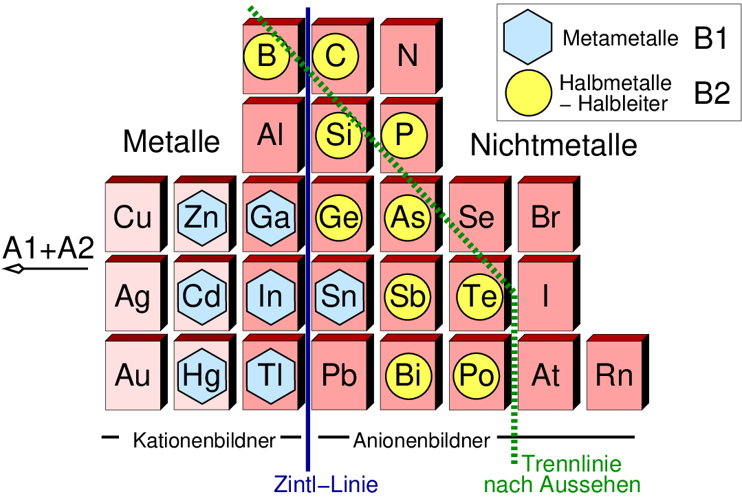 bilden die Übergangsglieder zwischen echten Metallen (A1 und A2) und Halbmetallen/Halbleitern (B2).