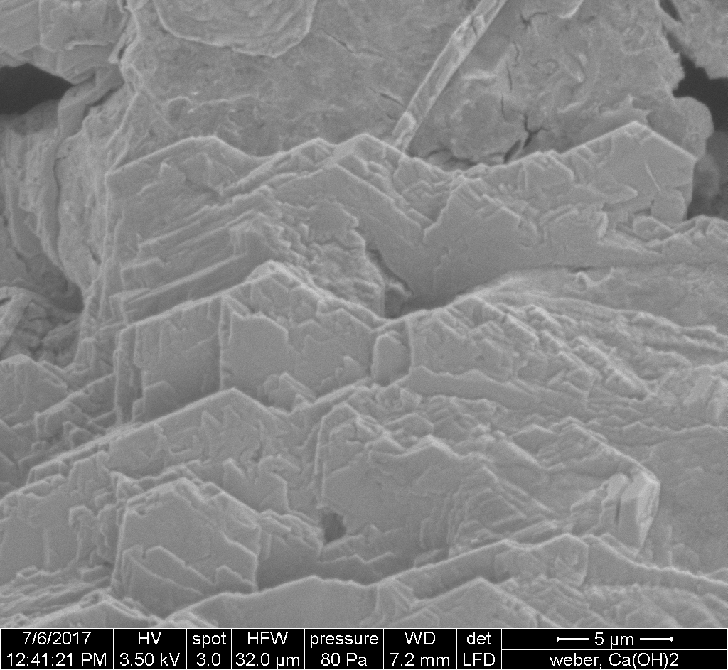 Dabei wird also Ca(OH)2 (CH) frei, das als blockartige Kristalle (Portlandit, Abb. 3.8.5.)