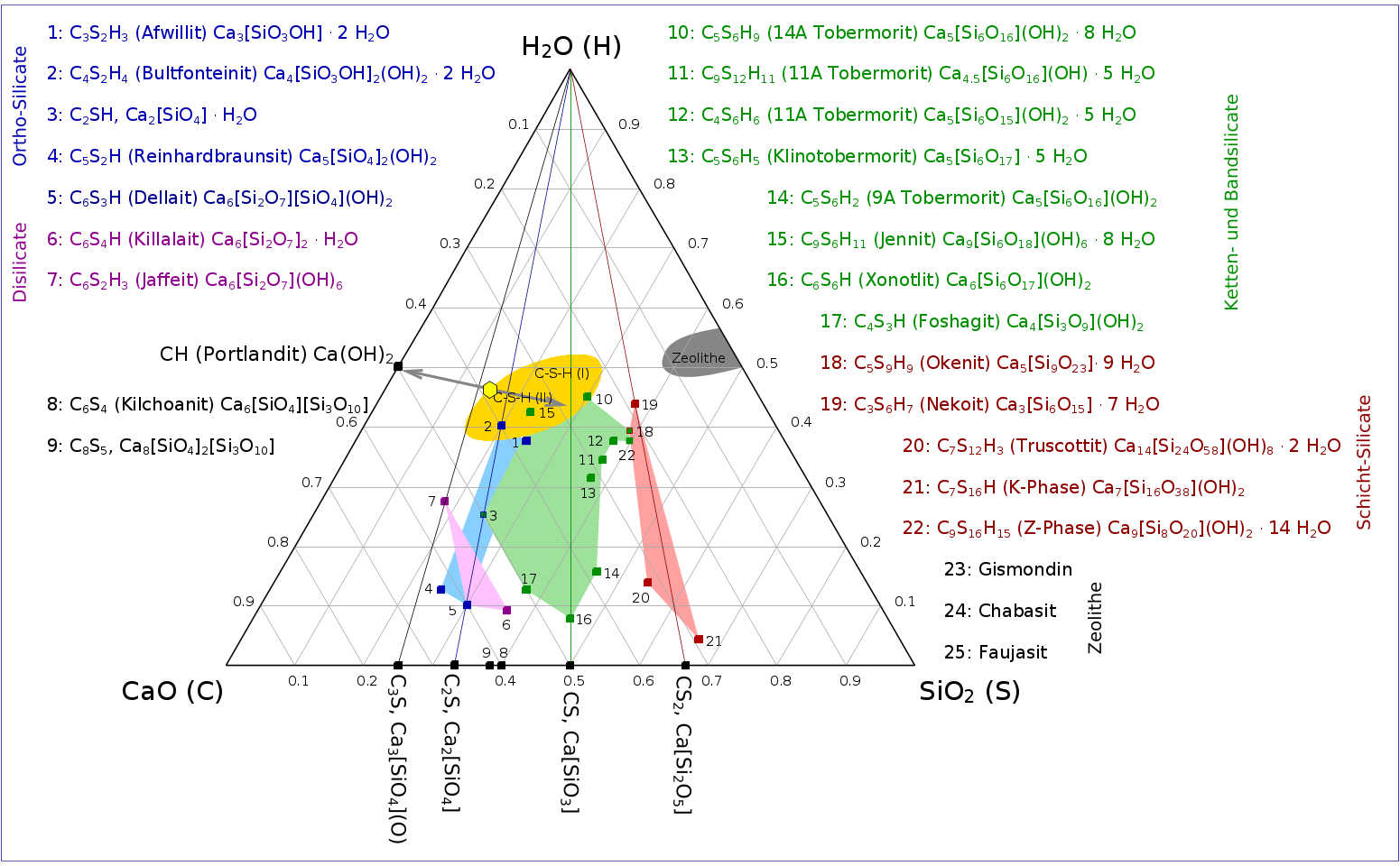 - Wer es ganz genau wissen will, betrachtet dazu das ternäre Diagramm der CSH-Phasen in Abb. 3.8.5,