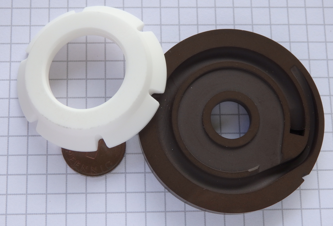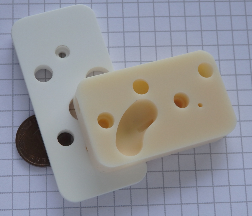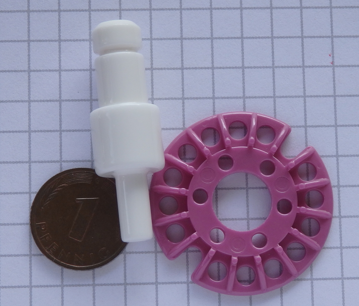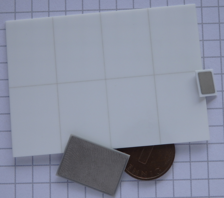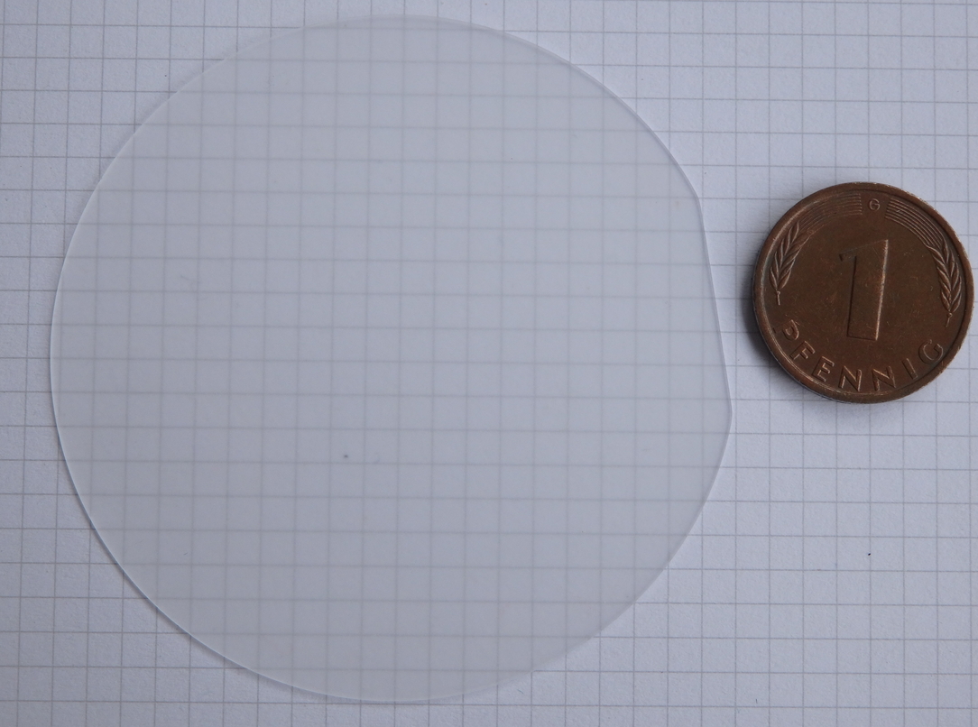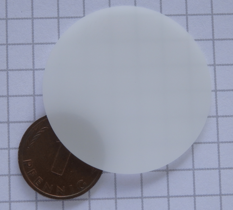 | Keramische Substrate, z.T. metallisiert (hergestellt durch Foliengiessen) | Einkristallscheibe aus Korund ('Saphir-Wafer', Dank an das IAF Freiburg) |