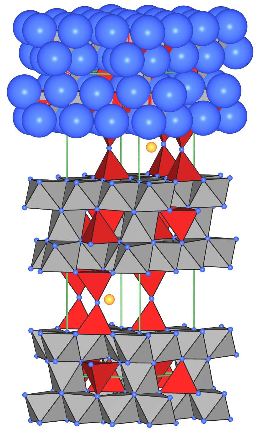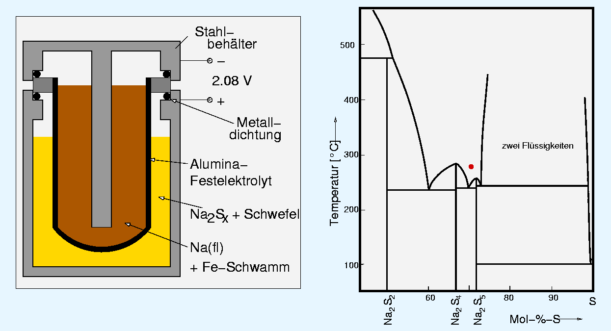 | 4.4.10. Packung der Oxid-Ionen in ß-Alumina (links), Struktur in Polyederdarstellung (Mitte: Na-Ionen gelb, Oxid-Ionen blau) sowie Prinzip der Natrium-Schwefel-Zelle (rechts, ‣SVG) | ||