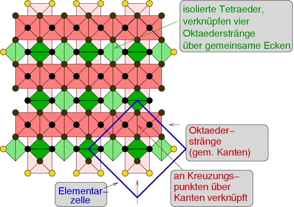 Insgesamt ergibt sich damit die die Zusammensetzung Mg2/8Al1/2O oder, mit vier multipliziert MgAl2O4. Die Verknüpfung der Oktaeder untereinander bzw. mit den Tetraedern ist in Abb. 4.4.7. schematisch dargestellt: