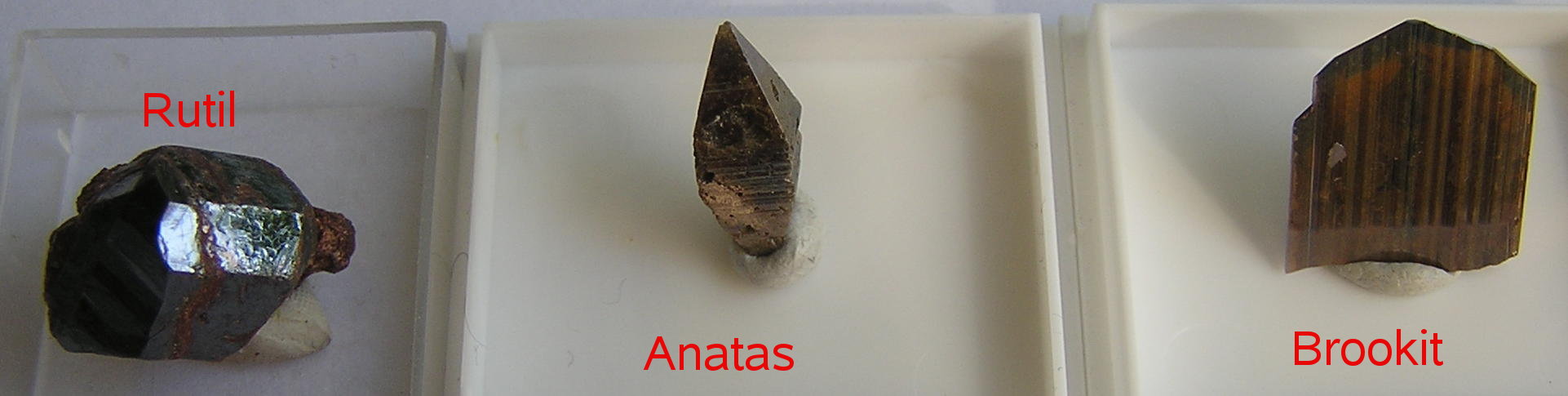 Die drei wichtigsten Titanerze, die meist rötlich bis schwarz sind,