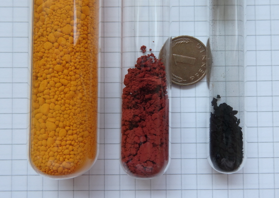 Gelbe Form von HgO (links) sowie die beiden Modifikationen von HgS (Mitte und rechts)