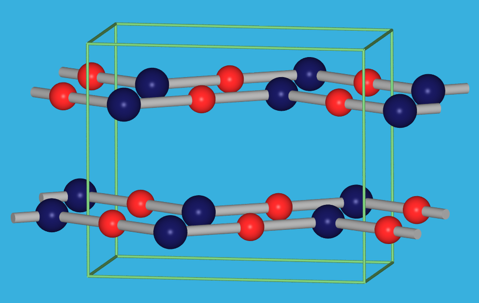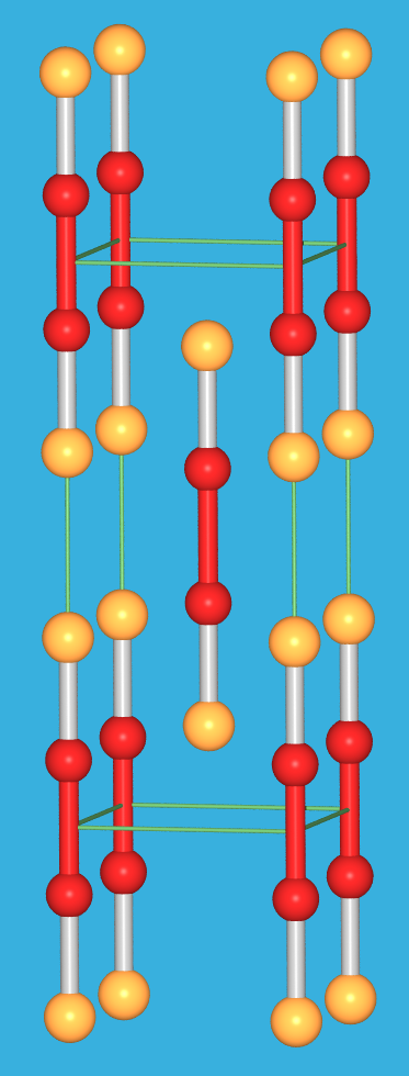 der roten und der gelben Form von HgO (rot: Hg; blau: O)
