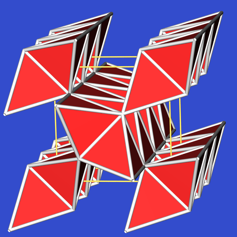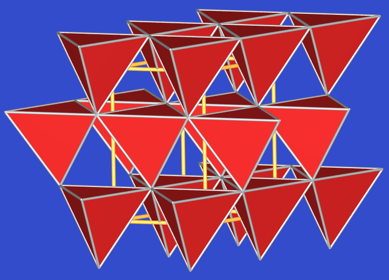 Oberhalb von 2050 bis 2100 oC geht es in die ß-Form (Abb. 2.3.2) über, die sich nicht abschrecken läßt. Die Struktur dieser Hochtemperaturmodifikation enthält BeO4-Doppeltetraeder (zwei über eine Kante verknüpfte Tetraeder). Dadurch resultieren kurze Be-Be-Abstände von 224 pm, die den Abständen im metallischen Element entsprechen. Isotyp dazu ist γ-LiAlO2.