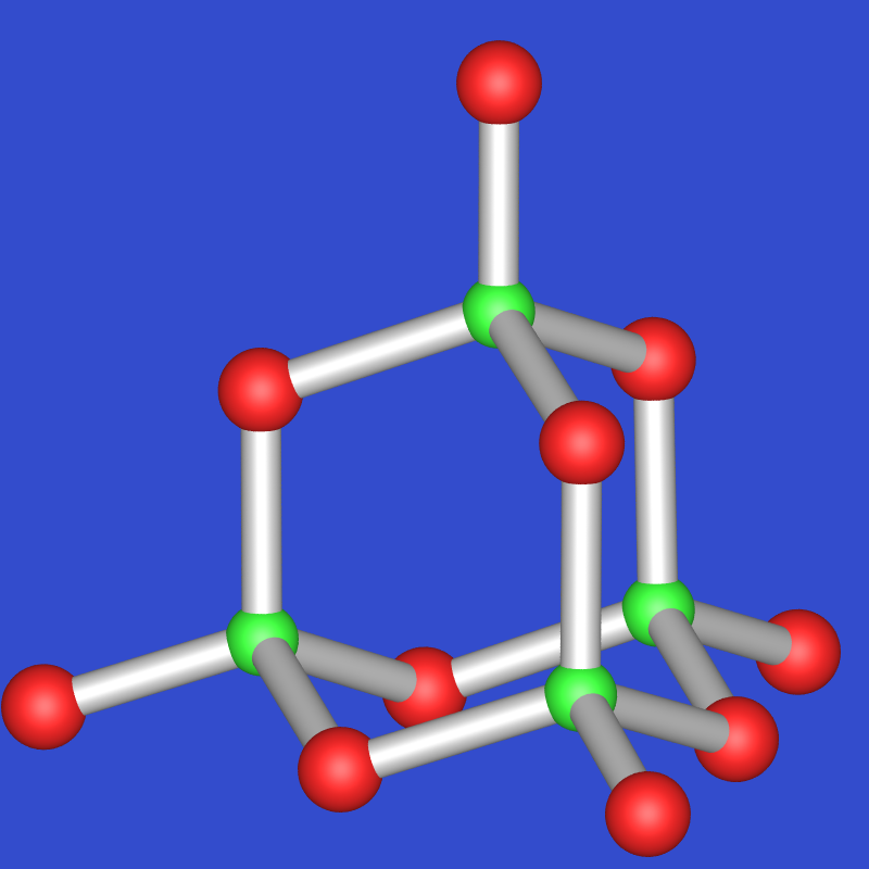 Von P4O10, dem Anhydrid der Phosphorsäure, sind insgesamt drei kristalline Modifikationen bekannt, die alle aus PO4-Tetraedern, die je über drei Ecken verknüpft sind, aufgebaut sind. Diese Modifikationen sind ein schönes Beispiel für gleiche Tetraeder mit identischer Verknüpfung, die entweder zu 0- (Moleküle), 2- (Schichten) oder 3- (Raumnetz) dimensionalen Verbänden führt.