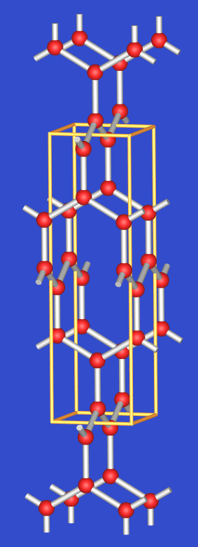 AsIII2O3 (Arsenik) neigt zwar zur Glasbildung, trotzdem sind aber zwei verschiedene kristalline Modifikationen bekannt. Die kubische Hochtemperaturform Arsenolith (Arsenikblüte, Hüttenrauch) schmilzt bei 278 oC. Die Struktur enthält Moleküle wie P4O6. Unterhalb von 110 oC wandelt sie sich in die monokline Tieftemperaturform, den Claudetit (Abb. 2.6.1.) um, der bei 313 oC schmilzt. Die Struktur besteht aus hexagonalen Sauerstoff-verbrückten As-Netzen, kann damit also ebenfalls aus der Elementstruktur durch Einschub von Sauerstoff in alle As-As-Bindungen abgeleitet werden. Die As-O-Abstände betragen 180 pm, der Winkel O-As-O 100 o.