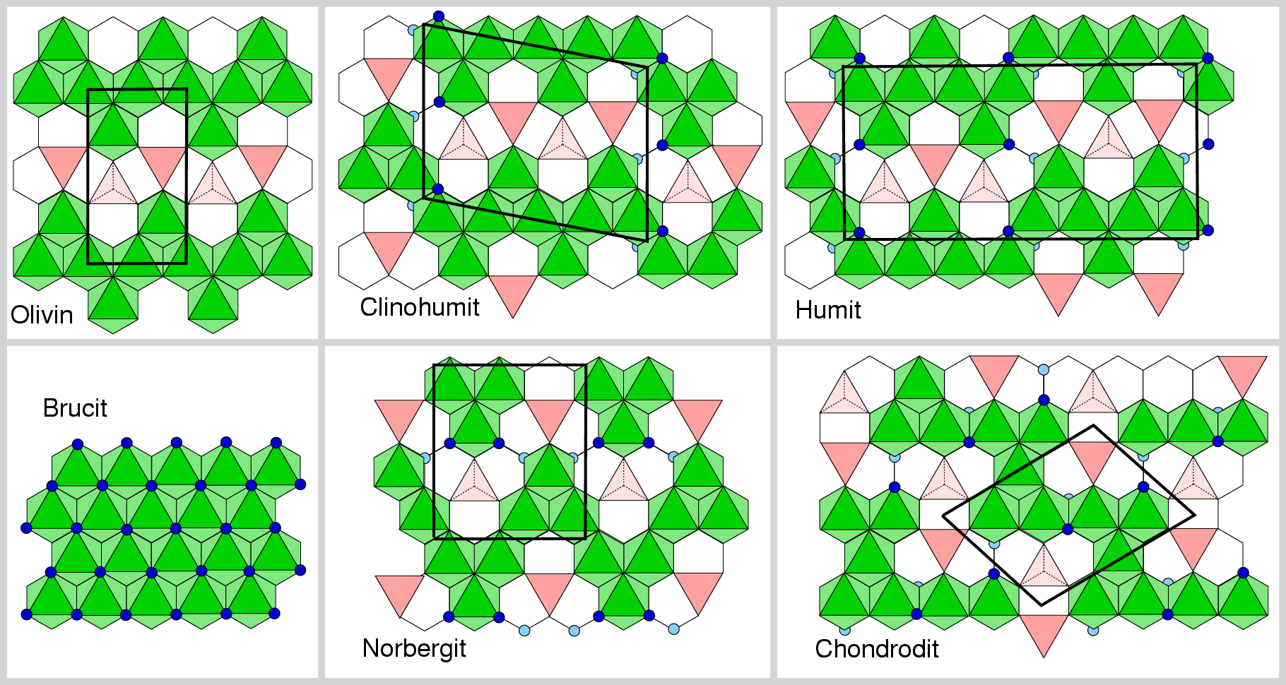 der von der Olivin-Struktur abgeleiteten Minerale (blaue Kugeln: OH--Ionen)