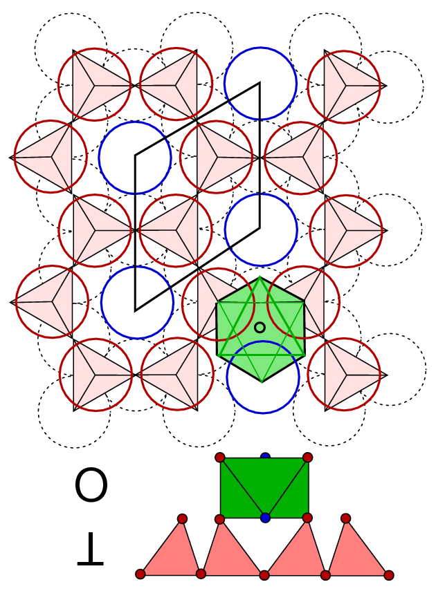 gemeinsam mit den Tetraederspitzen (rot) eine dichte Kugelpackung in der Ebene (Orientierung A)